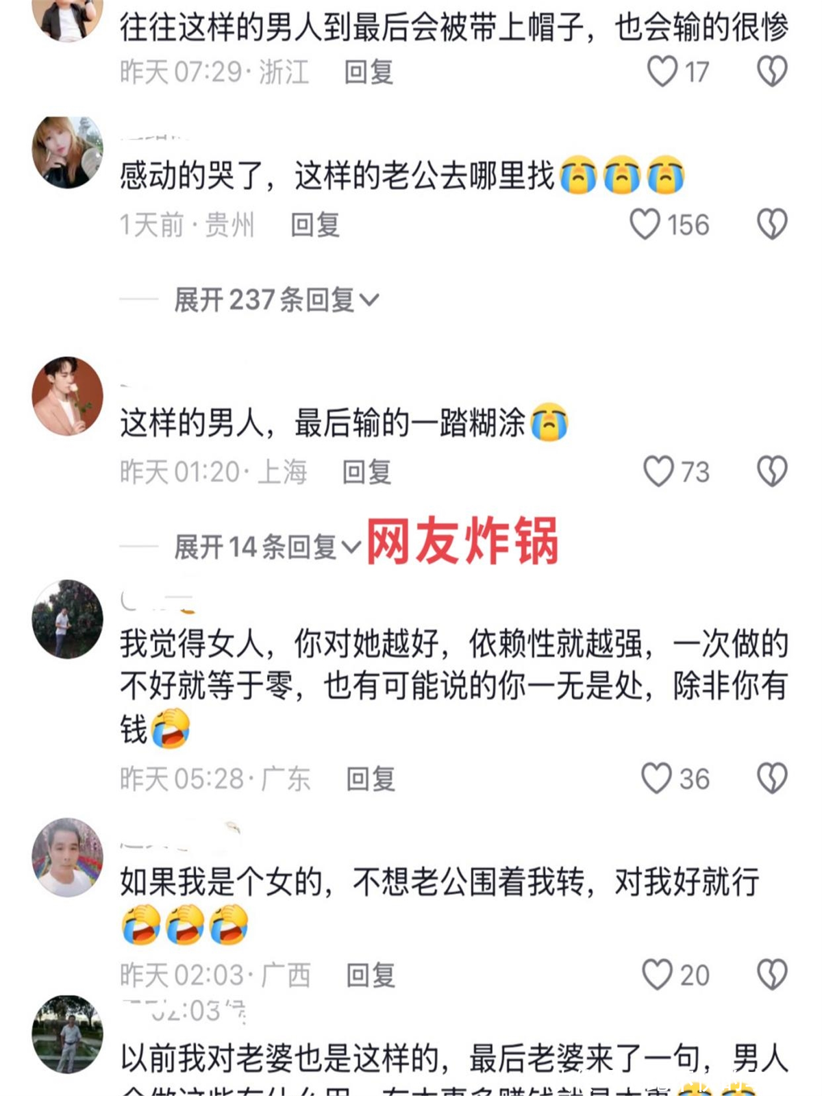 但也有过来人表示:“以后这个男的,一定会输得彻底,肯定要被戴帽子,就像我一样!男人最好要活得太卑微,否则不被珍惜!”